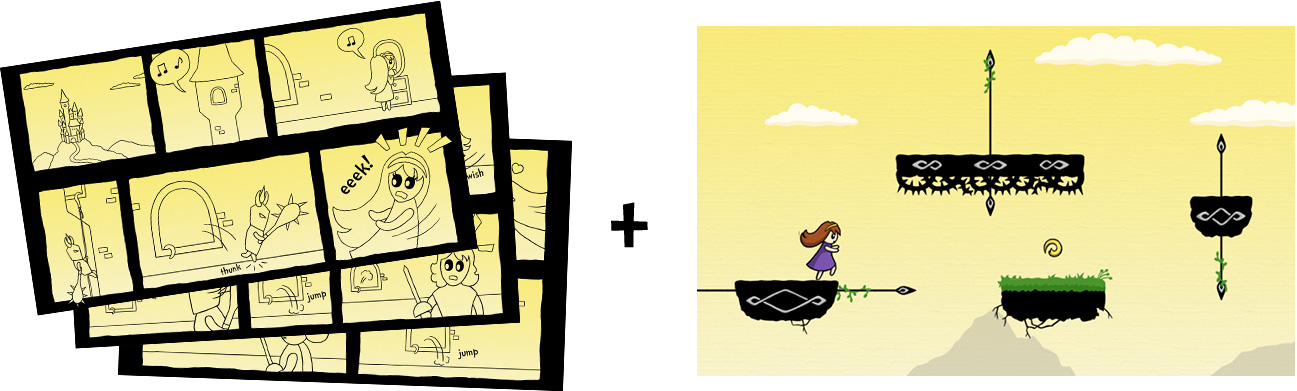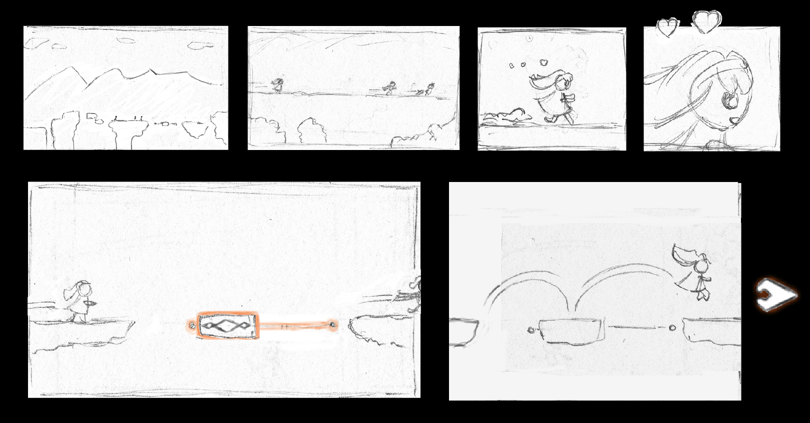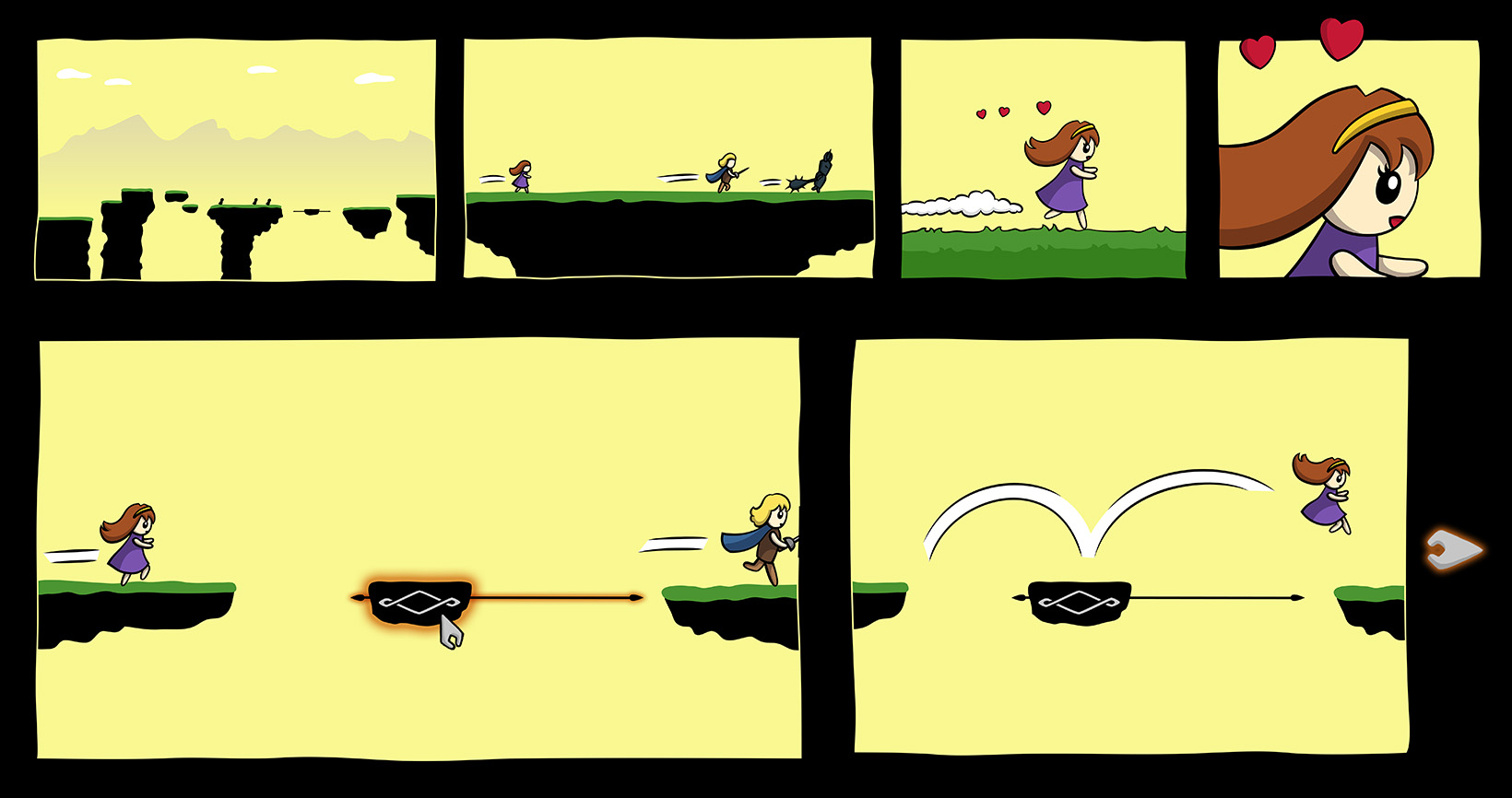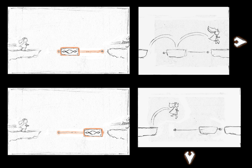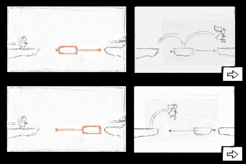 I created a prototype for one of the cutscenes with Flash and ActionScript using my sketches. In this scene, the player can decide whether to let princess Valory safely pass over a gap by using one of the movable platforms from the game.