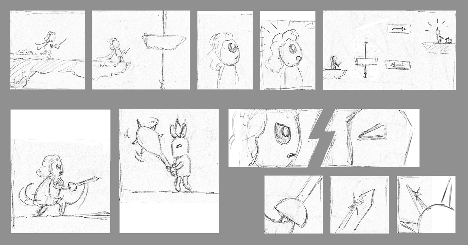 I started sketching story ideas for each gameplay element. I was playing with letting the characters get closer to their objective (e.g. the knight closing in on the villain) but just not reaching it. The player could then decide to help or hinder the character. The outcome would be the same in the end, but there were different ways of how the characters failed to reach their aim.