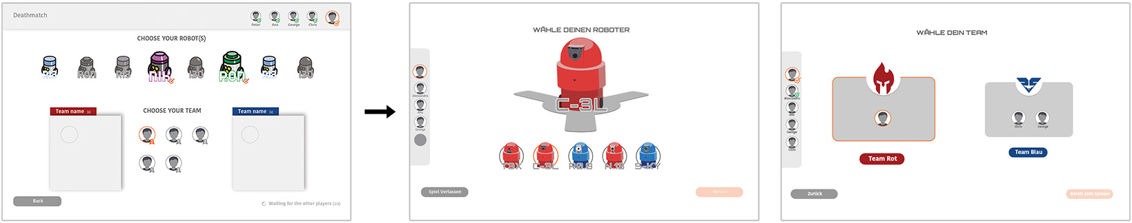 In the version we tested, we had tried to put the robot and team selection on the same screen, so players could easily see all the important information before entering a game. This however was very confusing and the users tried to combine robots, players and teams in all sorts of ways and had trouble figuring out how it works. After testing several different options that all did not work well I suggested moving back to separating both screens, which solved the issue.