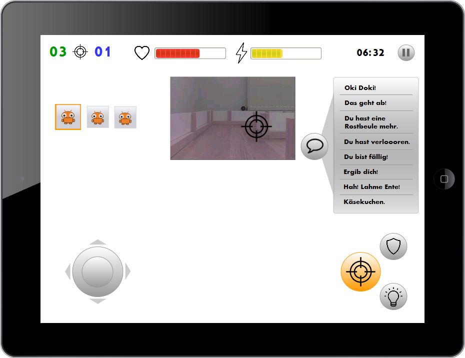 In the first version, the charging station was rather frustrating to use because the robot needed to be positioned very carefully and there was hardly any feedback telling the player if she had done it right. After discussing technical limitations and possibilities with the developer, I came up with the following solution: while the charging station was being recognised by the robot, the text "charging…" was flashing on the tablet directly underneath the camera image. Additionally, the robot was playing a sound. Compared to the first version where the increasing health points were the only feedback, this was an improvement that made using the charging station much easier.